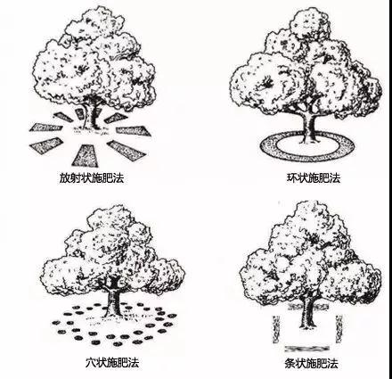 幼齡樹用環狀溝施法,成齡樹多采用條狀溝施法、放射溝施法、穴施法或全園撒施法;山區旱地果園多采用穴貯肥水法,具體方法如下: